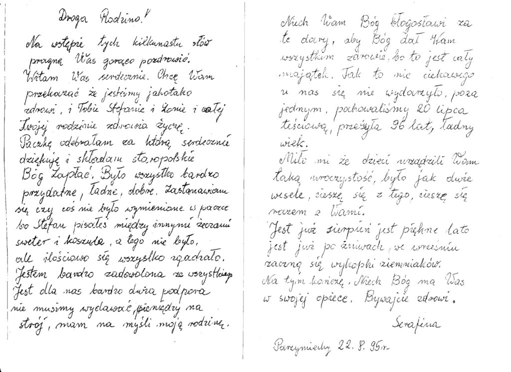 Well, after analyzing blurry pieces of the handwriting and studying a map of Poland, I eventually came up with the idea of the place mentioned in the letter. But the letter was sent in 1957! Who knows if the family still lives in the same place? maybe their descendants have different last names? I had some concerns before this onsite research but as some people say, no risk no fun. A few hours later I was there talking to the two older women on the street. As it turned out they lived there all their lives and knew almost everybody in the village. I was very lucky, the family lived still in the same place. We had a nice chat and as I found out later they were aware of relatives from New Zeland but had no idea how to get in touch with them. I was extremely happy that I helped them to regain lost contact.